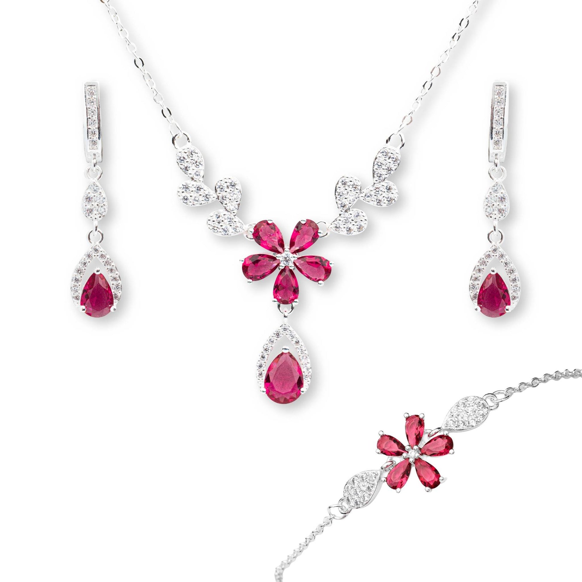 Zarveenah’s ZWS0245 set captures the essence of blossoming beauty with its exquisite floral design and radiant ruby red crystals. Crafted in premium sterling silver, this 5-piece collection exudes grace and timeless charm, making it the perfect choice for romantic evenings, bridal wear, or an elegant gift.