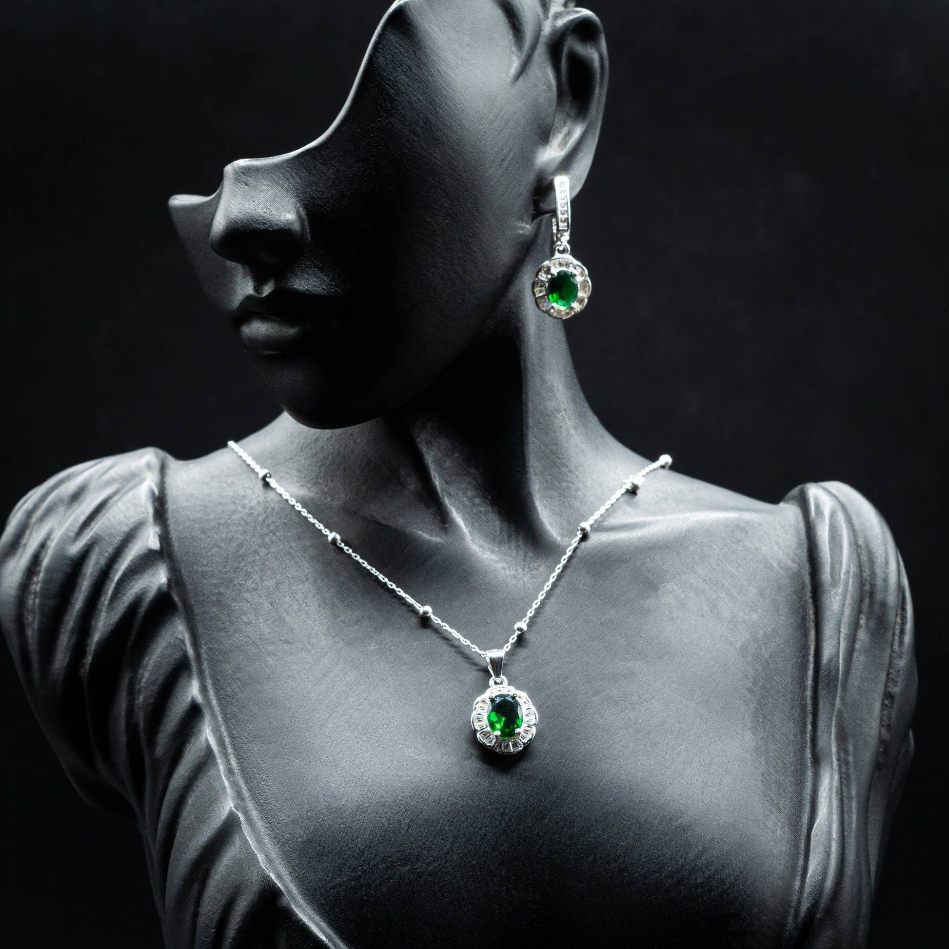- Gemstone Detail: Emerald green oval crystal framed by baguette-cut white halo stones