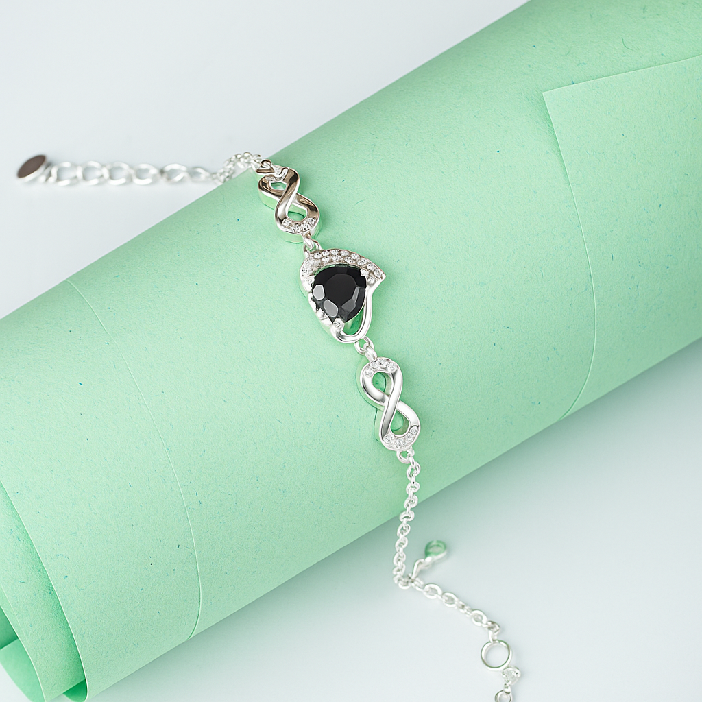 Bold and deeply symbolic, Zarveenah’s ZWB0132 bracelet is crafted for the woman who wears her story with elegance. A striking heart-shaped black crystal sits at the center, outlined by a shimmering pavé arc. On each side, polished sterling silver infinity symbols glisten with white crystal accents, representing eternal love and boundless style.