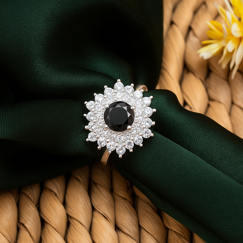 Command attention with the ZWR0159 ring by Zarveenah — a captivating blend of dark mystique and radiant brilliance. At the heart of this design lies a bold round-cut black stone, securely nestled in a four-prong setting and surrounded by a magnificent double halo of white pavé crystals.