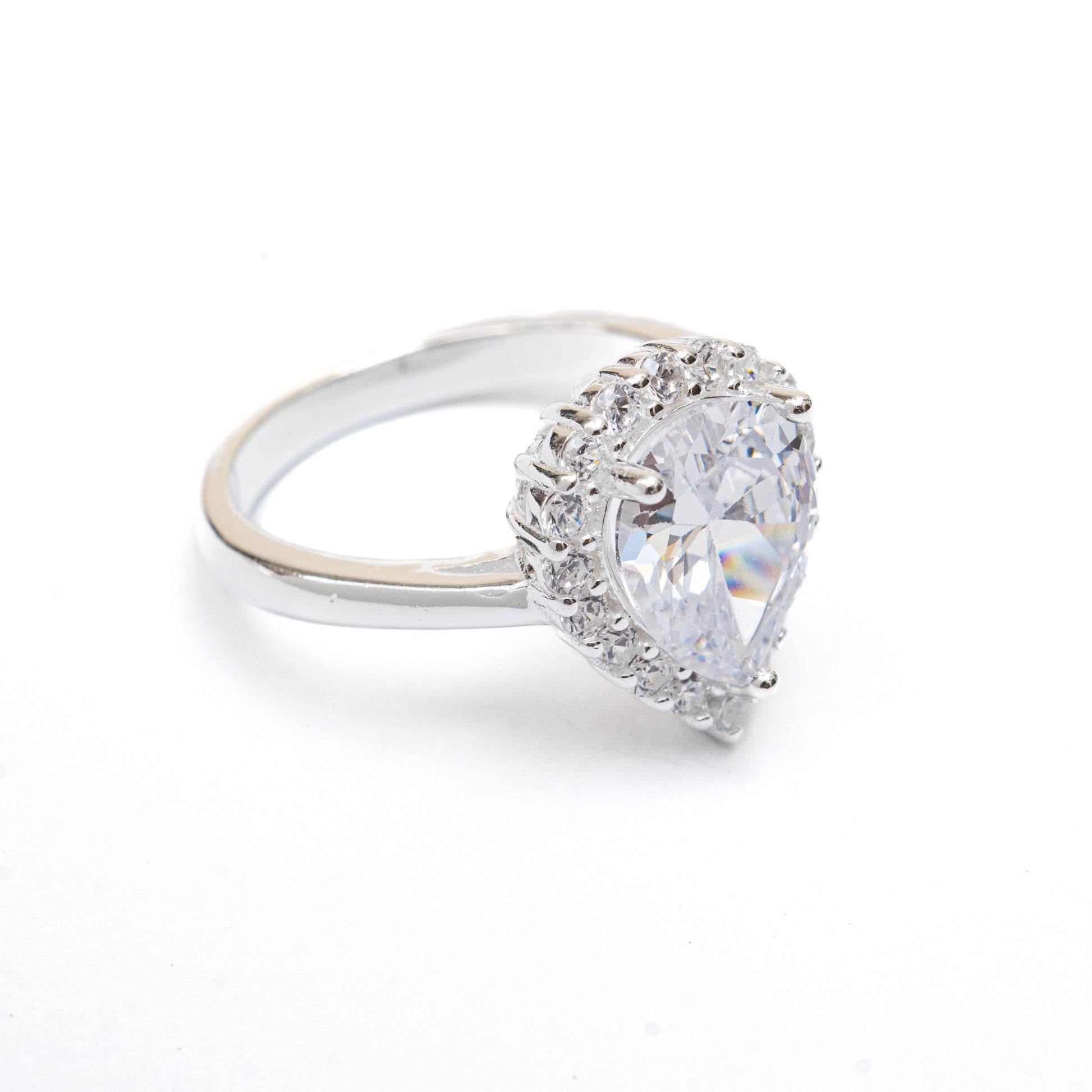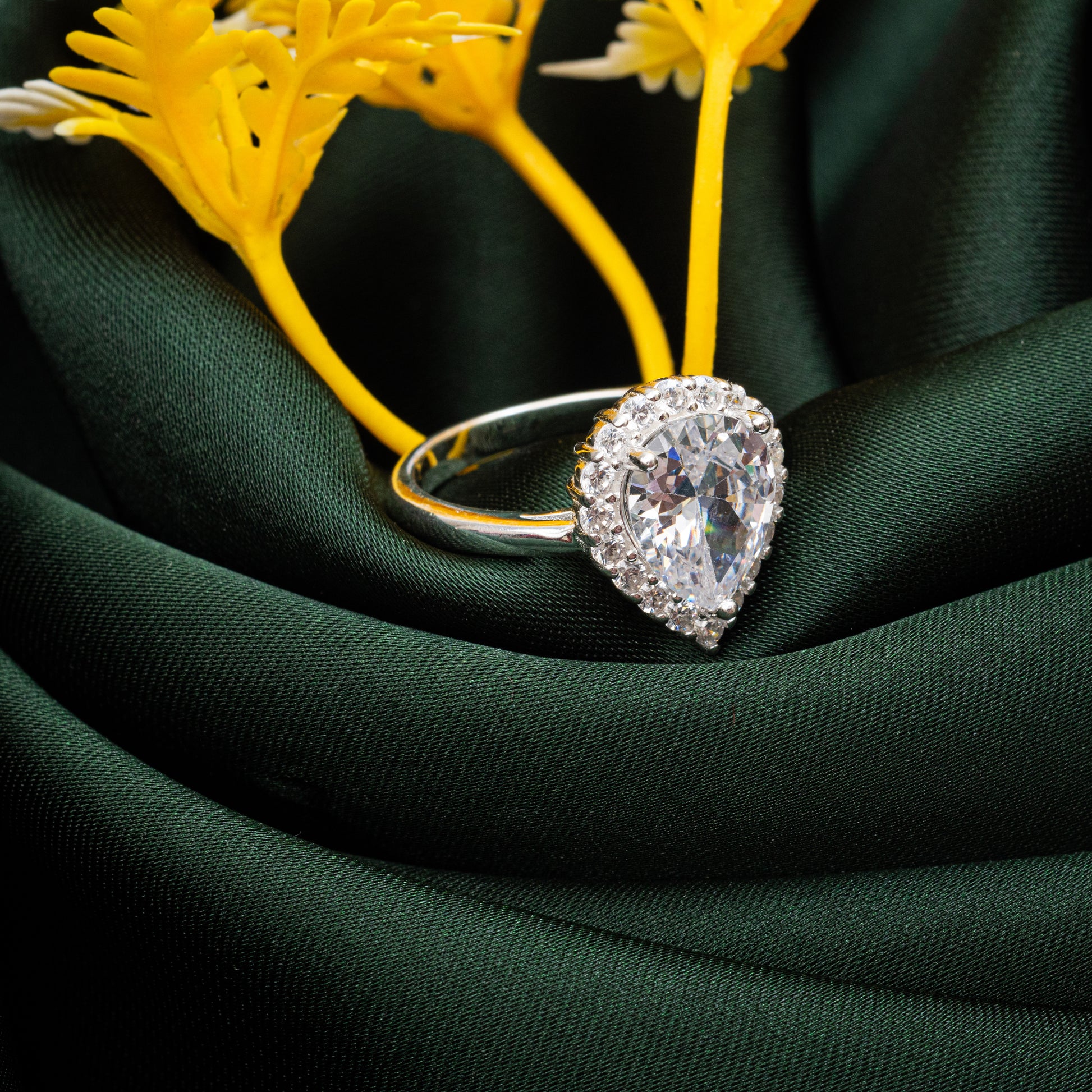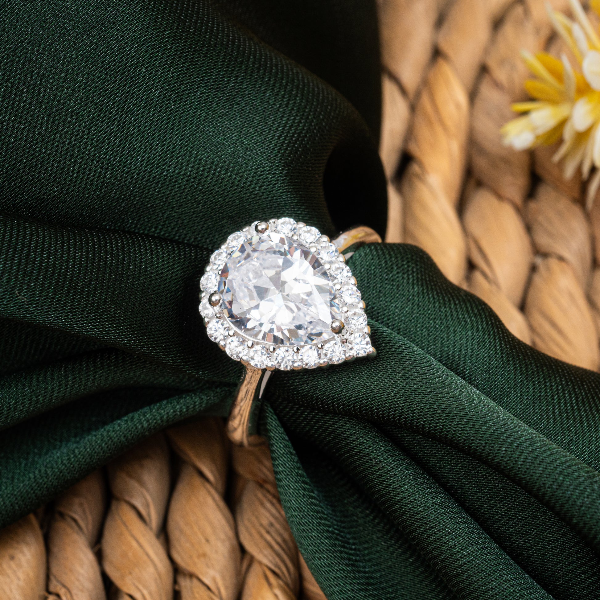 Elevate your elegance with the ZWR0137 ring by Zarveenah — a poetic blend of modern grace and classic sparkle. This stunning piece features a luminous pear-cut white center stone, symbolizing eternal tears of joy, embraced by a radiant halo of smaller clear crystals that amplify its brilliance from every angle.
