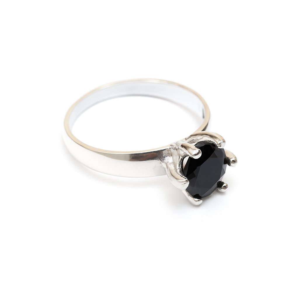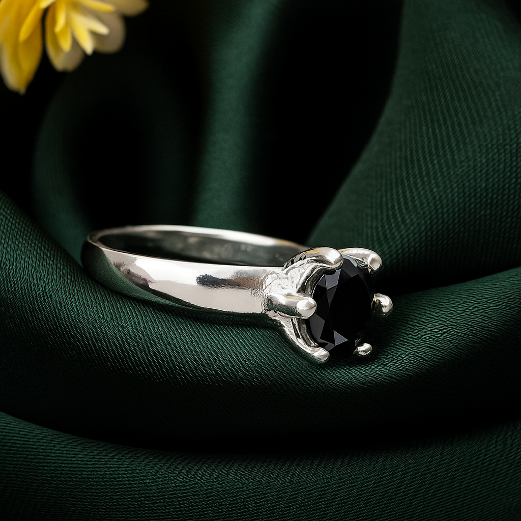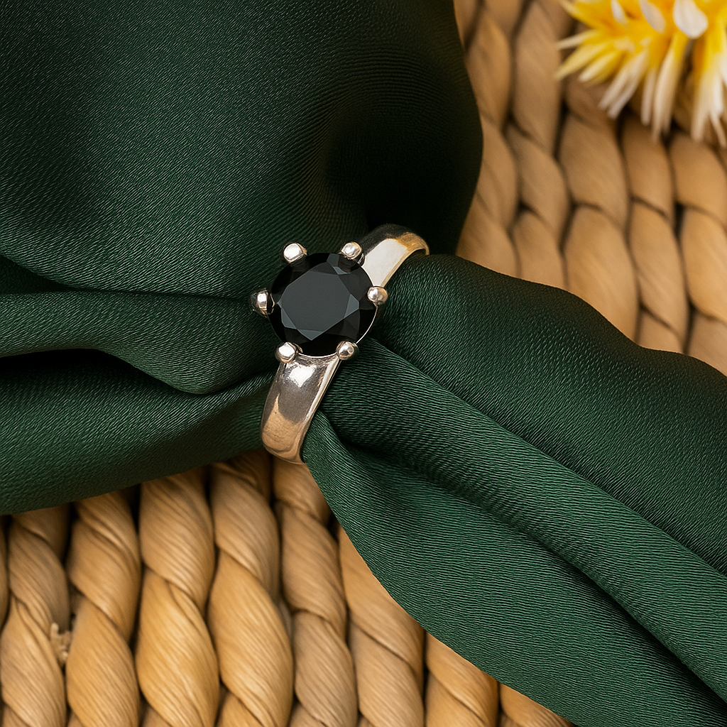 Elevate your elegance with the ZWR0158 ring by Zarveenah — a modern take on classic solitaire style. This striking design features a rich, jet-black round stone held in a secure claw setting, rising gracefully above a smooth, highly polished 925 sterling silver band. Minimalist yet bold, this piece captures the essence of sophisticated strength and confident femininity.