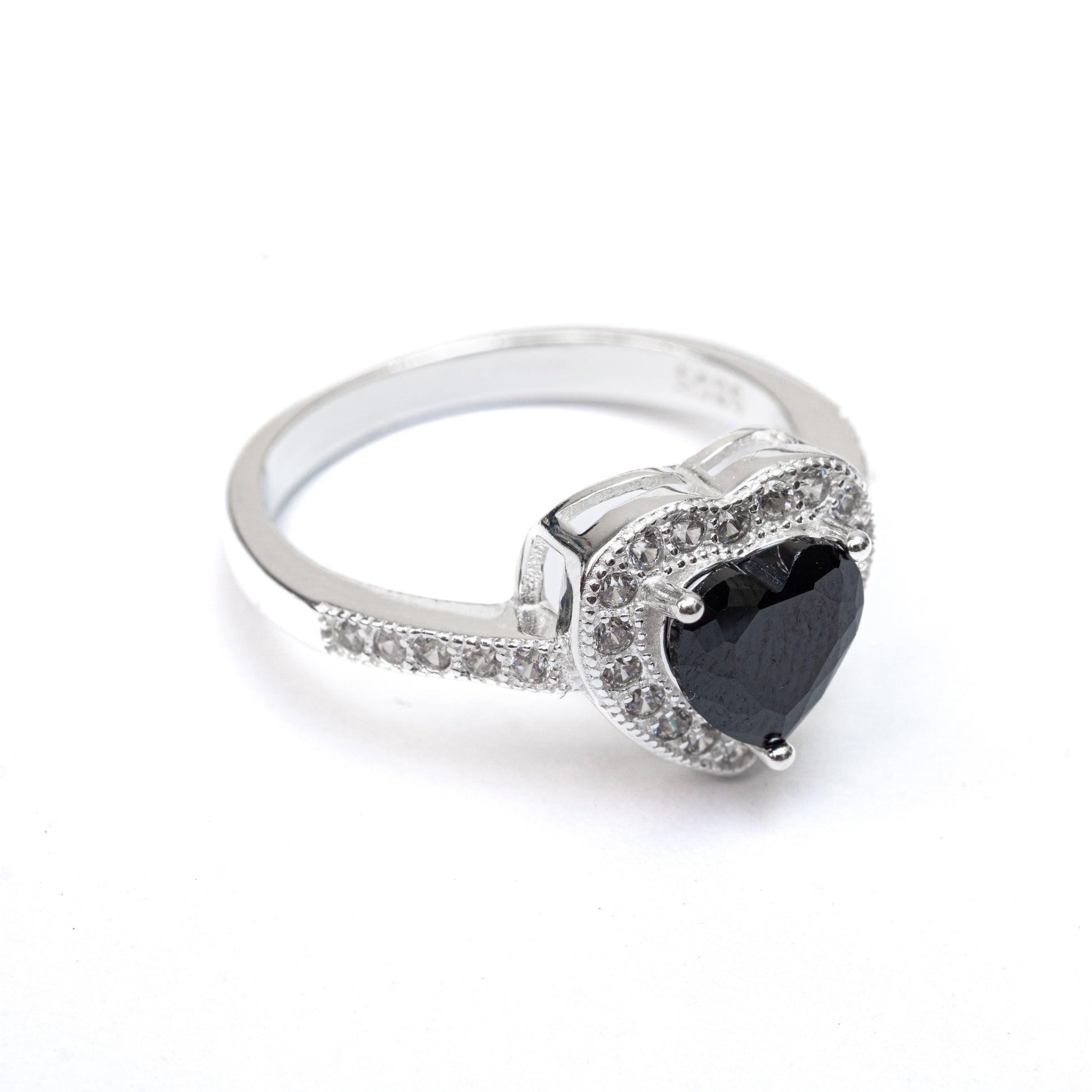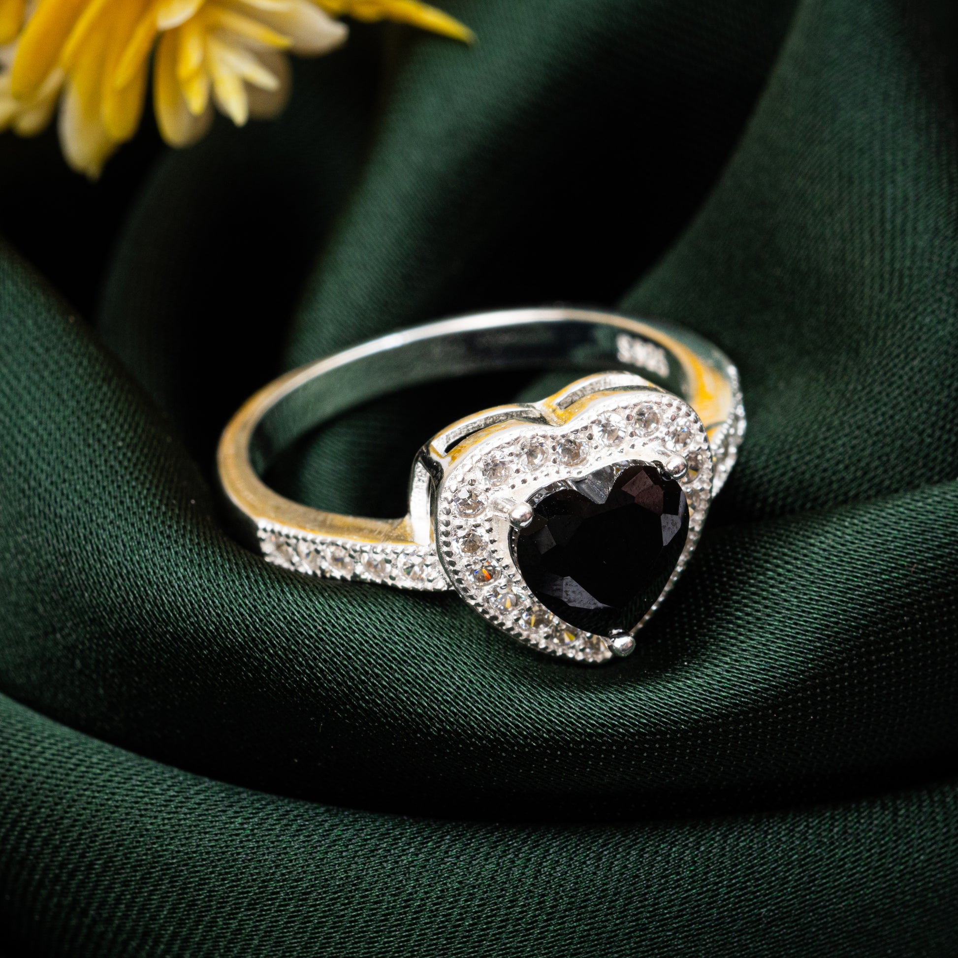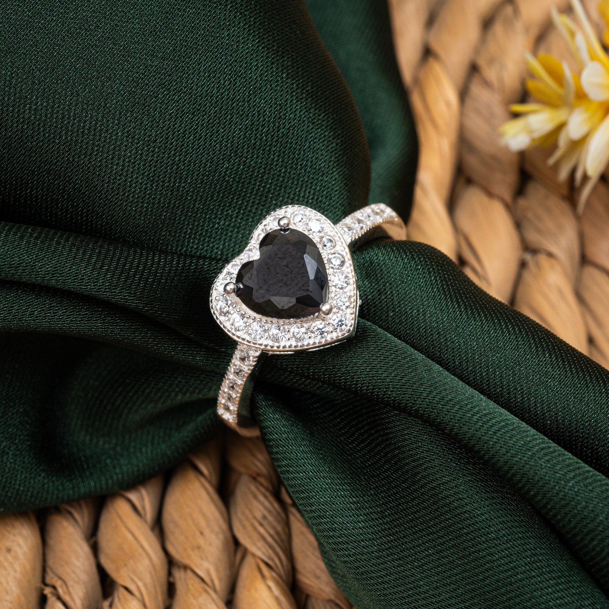 Celebrate timeless romance with the ZWR0151 from Zarveenah — a captivating heart-shaped ring that balances boldness and elegance. The centerpiece features a striking jet-black heart-cut gemstone, gracefully enclosed in a shimmering halo of white crystals that continue halfway along the band, adding brilliance from every angle.