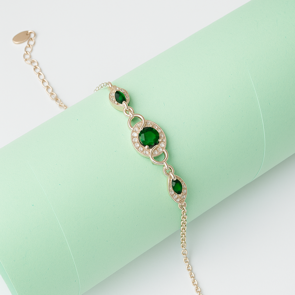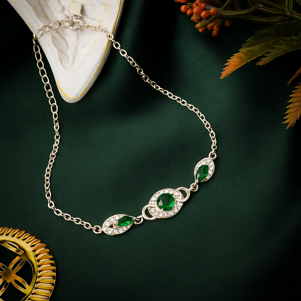 Zarveenah’s ZWB0131 bracelet is a refined blend of grace and grandeur. Crafted in 925 sterling silver with a lustrous gold-tone finish, this piece features a central oval-cut emerald green crystal surrounded by delicate pave-set white stones. On either side, leaf-shaped matching stones create an elegant symmetry — linked with curved connectors for a fluid, wrist-hugging fit.