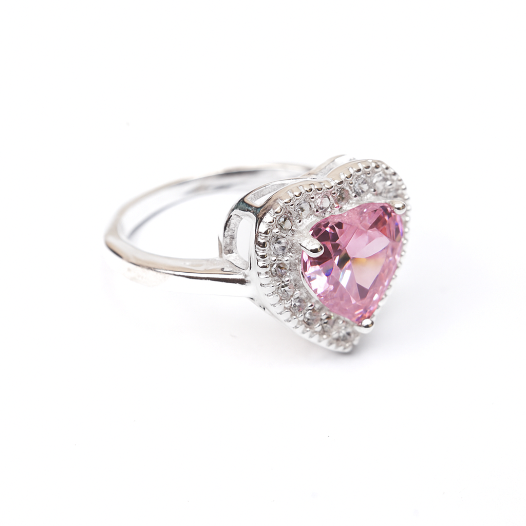 Celebrate love and elegance with the ZWR0153 women’s ring by Zarveenah — a poetic expression of feminine charm and romantic luxury. The centerpiece is a delicate heart-shaped blush pink gemstone, surrounded by a double halo of shimmering white crystals. This lovely composition rests atop a polished 925 sterling silver band, adding sophistication to every angle.